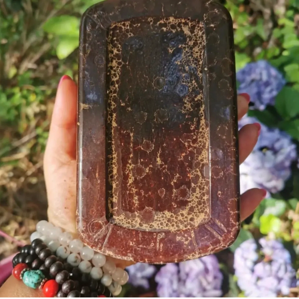La pâte de cacao est préparée de manière traditionnelle pour les cérémonies. Les fèves de cacao sont torréfiées légèrement sur une plaque chauffée aux feux de bois. Ensuite, elles sont décortiquées soigneusement à la main et sont bénies par les prières de la tribu avant d'être transformées en ce magnifique bloc de cacao pur.